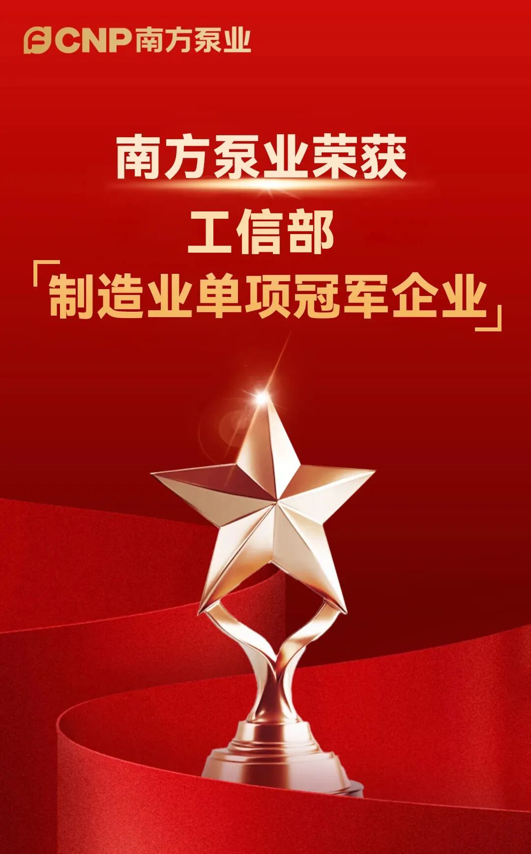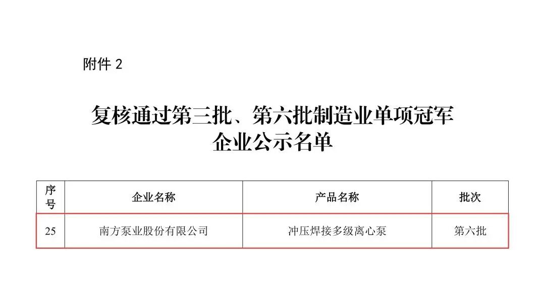 近日,南方泵业(300145)顺利通过制造业单项冠军企业复核,荣获工信部“制造业单项冠军企业”名单。
